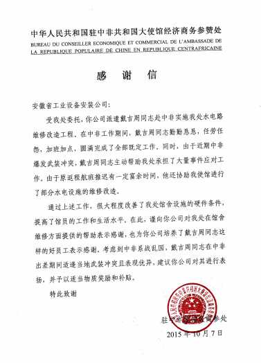 中華人民共和國駐中非共和國大使館經(jīng)濟(jì)商務(wù)參贊處向公司發(fā)來感謝信
