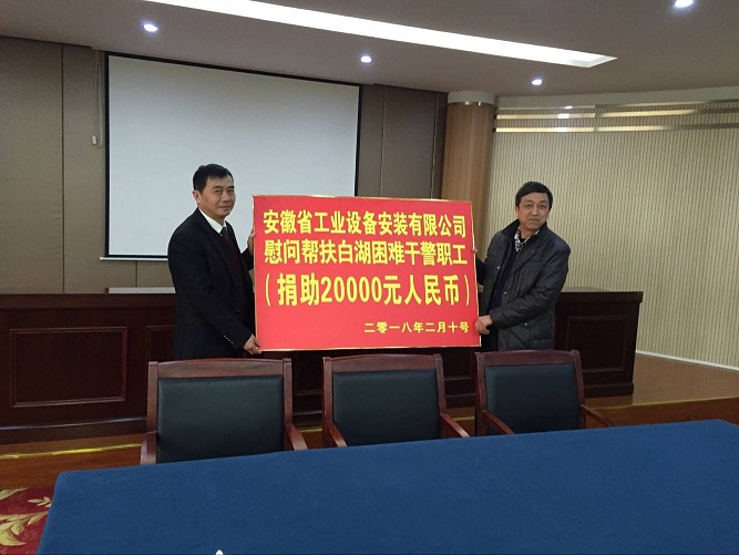 會(huì)上,李寬旭代表安徽安裝公司向白湖困難干警職工捐助慰問(wèn)幫扶金20000元。