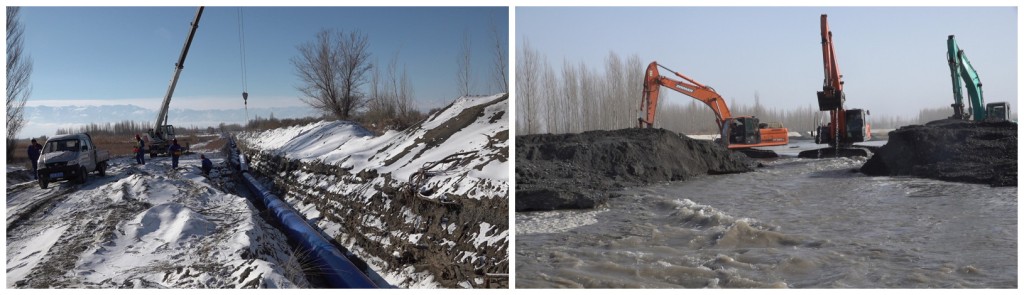 由于施工工期短,為了按時(shí)完成管道穿引洪渠任務(wù),目前,在項(xiàng)目執(zhí)行經(jīng)理柴琳、項(xiàng)目副經(jīng)理張寶深以及項(xiàng)目技術(shù)負(fù)責(zé)人蔡京利的帶領(lǐng)下,項(xiàng)目部正在堅(jiān)持24小時(shí)不間斷施工;除此之外,由于施工現(xiàn)場“戰(zhàn)線長”,距離附近集鎮(zhèn)和項(xiàng)目部基地都較遠(yuǎn),項(xiàng)目部在河渠邊搭建兩個(gè)軍用帳篷做為施工指揮部,“冷饃硬馕加泡面”成了項(xiàng)目部午餐“標(biāo)配”。施工間歇,施工人員就在管溝邊用撿到的枯木點(diǎn)燃火堆取暖。在穿越四棵樹河施工段施工過程中,管溝挖深總共約4米,但管溝中的水深卻高達(dá)3米,由于管道安裝滿足標(biāo)高要求,即使面臨開挖出水多,施工難度大的困境,項(xiàng)目副經(jīng)理馬讓同志依舊毫不猶豫地召集起項(xiàng)目上的黨員同志,帶頭穿上雨衣皮褲,站在挖機(jī)斗中下河扶塔尺測(cè)標(biāo)高,保證管道安裝質(zhì)量。他們的身影深深地感染著項(xiàng)目上的每一個(gè)人。在四棵樹河中管道施工時(shí),需要將上游河水截流,時(shí)間緊任務(wù)重,項(xiàng)目全體員工不喊累不叫苦,沒日沒夜加班奮戰(zhàn),搶抓施工進(jìn)度......