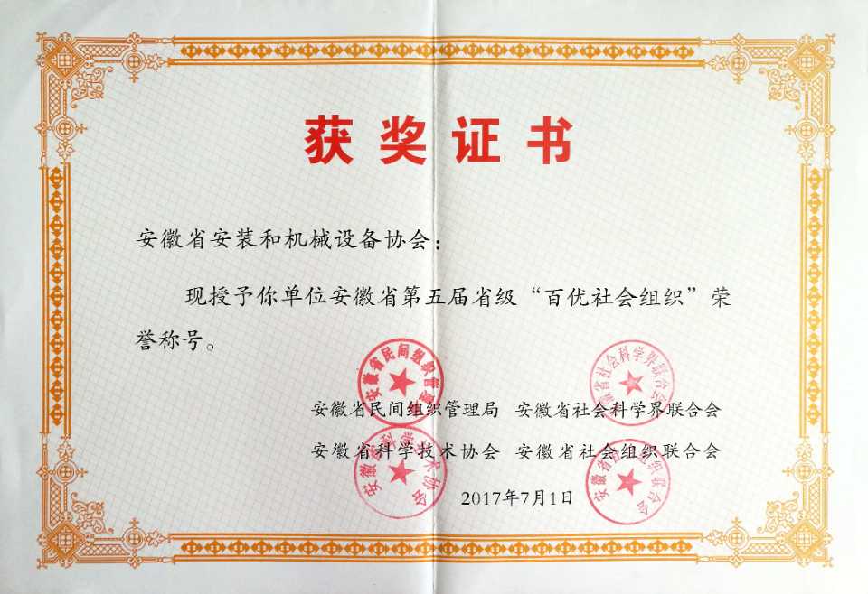 2017年7月,安徽省安裝和機(jī)械設(shè)備協(xié)會(huì)第三次榮獲安徽省第五屆省級(jí)“百優(yōu)社會(huì)組織”稱號(hào),并由安徽省民間組織管理局、安徽省社會(huì)科學(xué)界聯(lián)合會(huì)、安徽省科學(xué)技術(shù)協(xié)會(huì)、安徽省社會(huì)組織聯(lián)合會(huì)聯(lián)合頒發(fā)了榮譽(yù)證書(shū)。