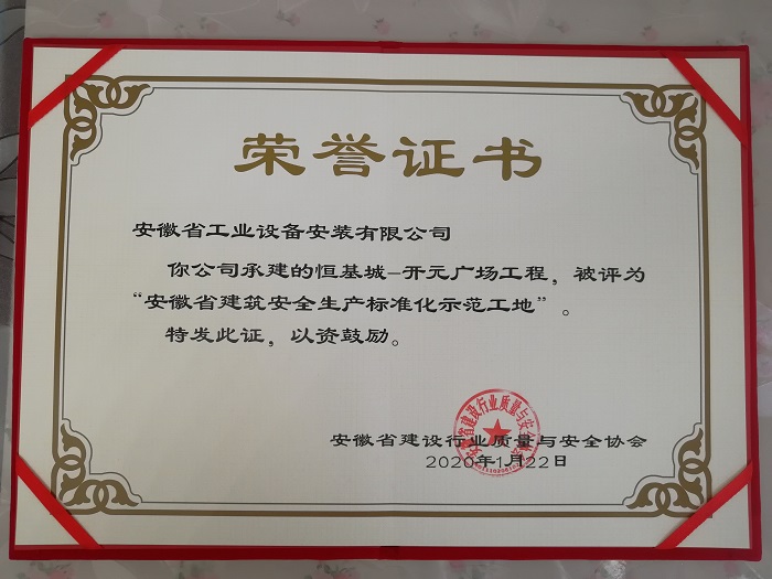 2019年12月,淮北恒基城開元廣場項(xiàng)目開始對項(xiàng)目文明標(biāo)化進(jìn)行申報(bào),并著手準(zhǔn)備文明標(biāo)化申報(bào)資料,經(jīng)過項(xiàng)目管理人員的不懈努力,項(xiàng)目于2020年1月13日順利通過安徽省建筑安全生產(chǎn)標(biāo)準(zhǔn)化示范工地驗(yàn)收工作,2019年4月份取得“安徽省建筑安全生產(chǎn)標(biāo)準(zhǔn)化示范工地”榮譽(yù)稱號。