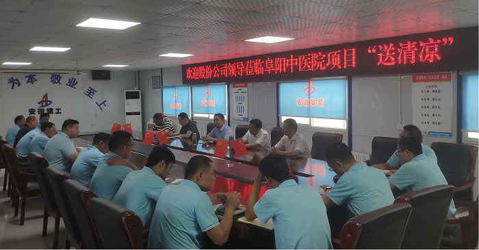7月16日上午,股份公司副總經(jīng)理黃代、證券事務(wù)部副部長(zhǎng)盛道勝赴安徽安裝公司阜陽潁東區(qū)中醫(yī)院建設(shè)PPP項(xiàng)目“送清涼”并調(diào)研指導(dǎo)工作。安徽安裝黨委書記、董事長(zhǎng)胡六中,副總經(jīng)理高飛參加調(diào)研。