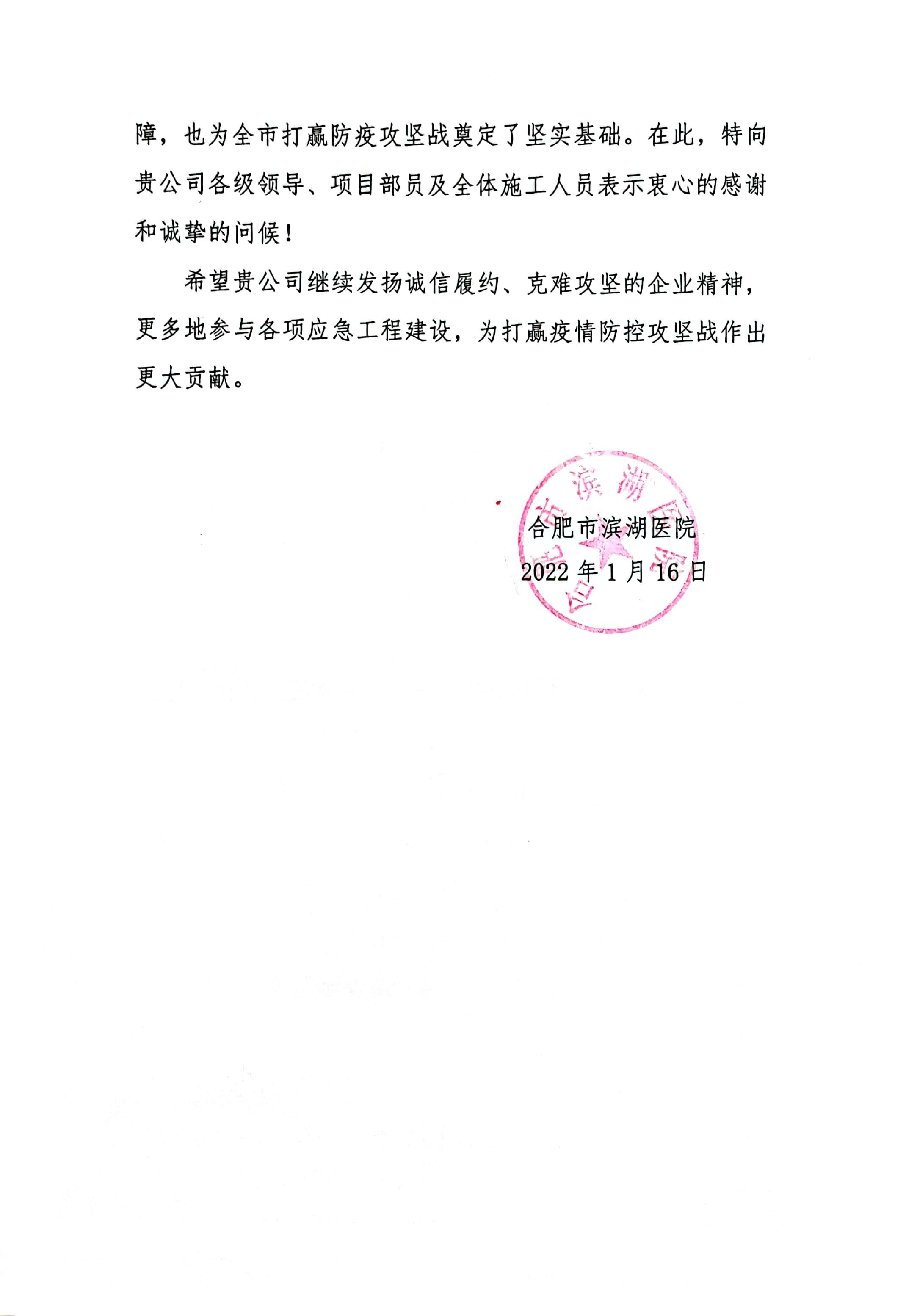 近日,安徽安裝公司收到合肥市濱湖醫(yī)院表揚(yáng)信,信中高度贊揚(yáng)公司濱湖醫(yī)院感染病區(qū)及發(fā)熱門診應(yīng)急改造工程設(shè)計(jì)施工一體化方艙醫(yī)院項(xiàng)目克服重重困難,縮短工期,一個(gè)月的時(shí)間內(nèi)按期交付使用。該項(xiàng)目充分展現(xiàn)了安徽安裝作為國有企業(yè)擔(dān)當(dāng)履責(zé)的社會(huì)責(zé)任,為合肥市打贏防疫攻堅(jiān)戰(zhàn)奠定了堅(jiān)實(shí)基礎(chǔ)。