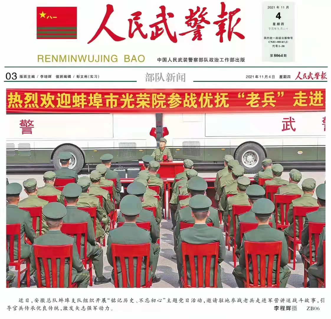 近日,《中國軍視網(wǎng)》《人民武警報(bào)》專題報(bào)道安徽安裝蚌埠分公司年飛同志作為參戰(zhàn)退伍老兵講授專題黨課。