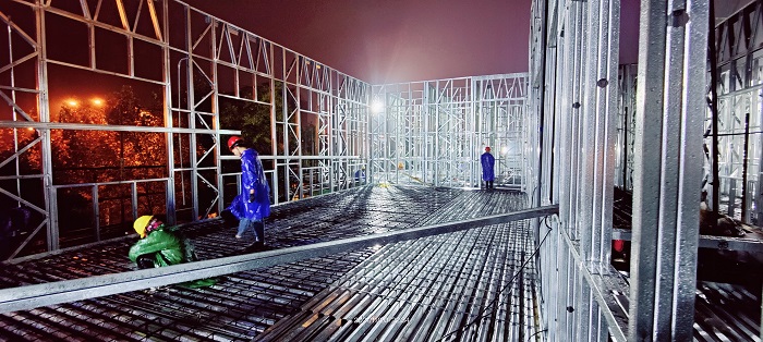 自11月初接到項(xiàng)目任務(wù)以來(lái),面對(duì)一個(gè)月完成三層結(jié)構(gòu)方艙醫(yī)院主體機(jī)構(gòu)、內(nèi)部安裝、室外裝飾的極限工期,安徽安裝公司高度重視、精心組織、科學(xué)安排、迎難而上,全力以赴加快工程建設(shè),期間,公司領(lǐng)導(dǎo)多次前往項(xiàng)目現(xiàn)場(chǎng)幫助協(xié)調(diào)解決工程施工中的難點(diǎn)、困難,為項(xiàng)目人員鼓勁加油;公司相關(guān)部門(mén)負(fù)責(zé)人駐扎項(xiàng)目一線,指導(dǎo)協(xié)調(diào)內(nèi)部流程、現(xiàn)場(chǎng)施工、外部對(duì)接、質(zhì)量安全等一應(yīng)事務(wù);分公司第一時(shí)間組織精干力量進(jìn)入項(xiàng)目現(xiàn)場(chǎng),梳理現(xiàn)場(chǎng)情況,核對(duì)圖紙清單,進(jìn)行施工準(zhǔn)備。從公司領(lǐng)導(dǎo)到項(xiàng)目一線,安徽安裝公司自上而下以高度的使命感和責(zé)任感,投入到緊張的工程建設(shè)中去。項(xiàng)目管理人員披星戴月,從早上到夜間駐守在項(xiàng)目一線,每日召開(kāi)工程會(huì)議,討論施工工作進(jìn)展,制定下一步工作計(jì)劃,安排交叉作業(yè)工序。為保障夜間施工安全,項(xiàng)目部安排兩名安全員輪流值守項(xiàng)目現(xiàn)場(chǎng),夜間在項(xiàng)目現(xiàn)場(chǎng)不斷巡查確保施工安全、高效開(kāi)展。