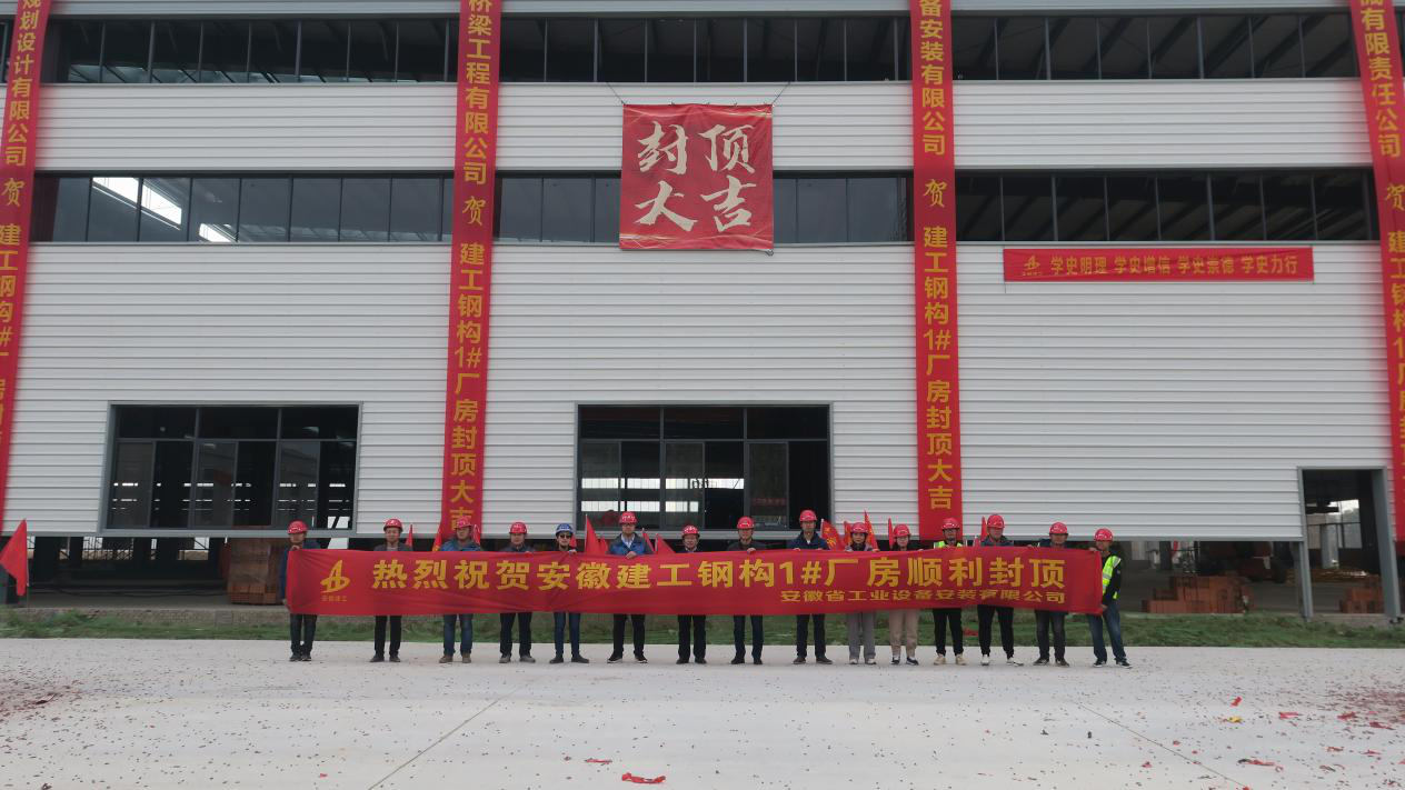 大干四季度,起航再沖鋒。12月8日上午,隨著最后一片屋面板的鋪設完成,合肥分公司建工鋼構項目1#廠房順利封頂,標志著建工鋼構項目主體施工全部完成。安徽路橋橋梁分公司黨總支書記、副總經(jīng)理劉振嶺、公司總經(jīng)理助理、合肥分公司黨支部書記、經(jīng)理趙永峰等出席封頂儀式。與項目部全體員工共同見證這一重要時刻。