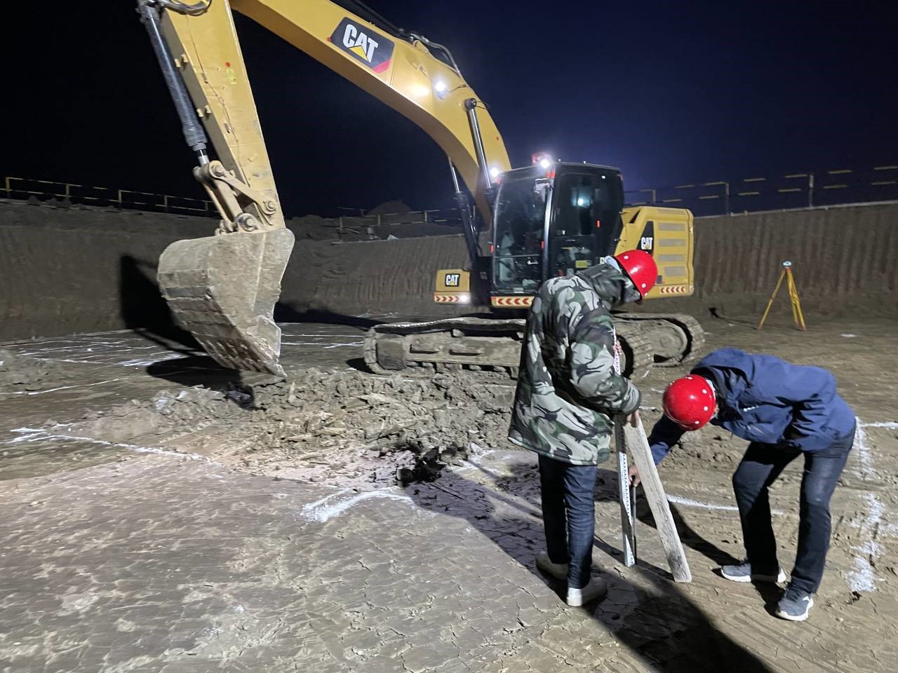 為滿足西動力中心承臺澆筑要求,施工現(xiàn)場燈火通明,項目經(jīng)理徐明東帶領(lǐng)施工員正在認真進行西動力中心承臺基礎(chǔ)測量復核工作。
