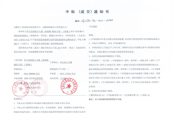 2022年8月12日,安徽安裝市政分公司在合肥市公共資源交易平臺上以聯(lián)合體牽頭人身份投標(biāo)廬江縣新建立人路(福泉路-城西大道)工程施工項目并一舉中標(biāo)!該項目是連接廬江縣福泉路與城西大道之間的道路,總長約1250米,規(guī)劃為雙向四車道,道路等級為次干路,設(shè)計時速40km/h;主要施工內(nèi)容有道路工程、排水工程、綠化工程、照明工程、交通(土建)以及其他附屬工程等,中標(biāo)金額3274.17萬元。