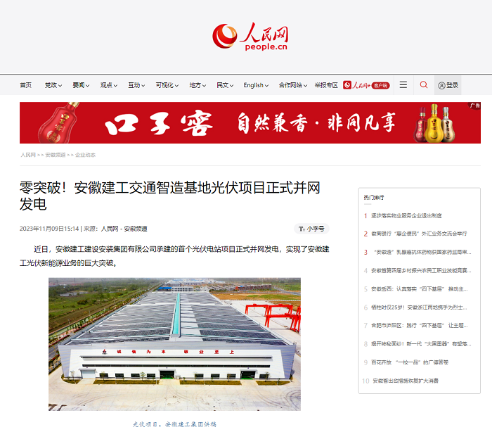 近日,人民網(wǎng)專題報(bào)道公司承建的首個(gè)光伏電站項(xiàng)目正式并網(wǎng)發(fā)電,實(shí)現(xiàn)了安徽建工光伏新能源業(yè)務(wù)的巨大突破。