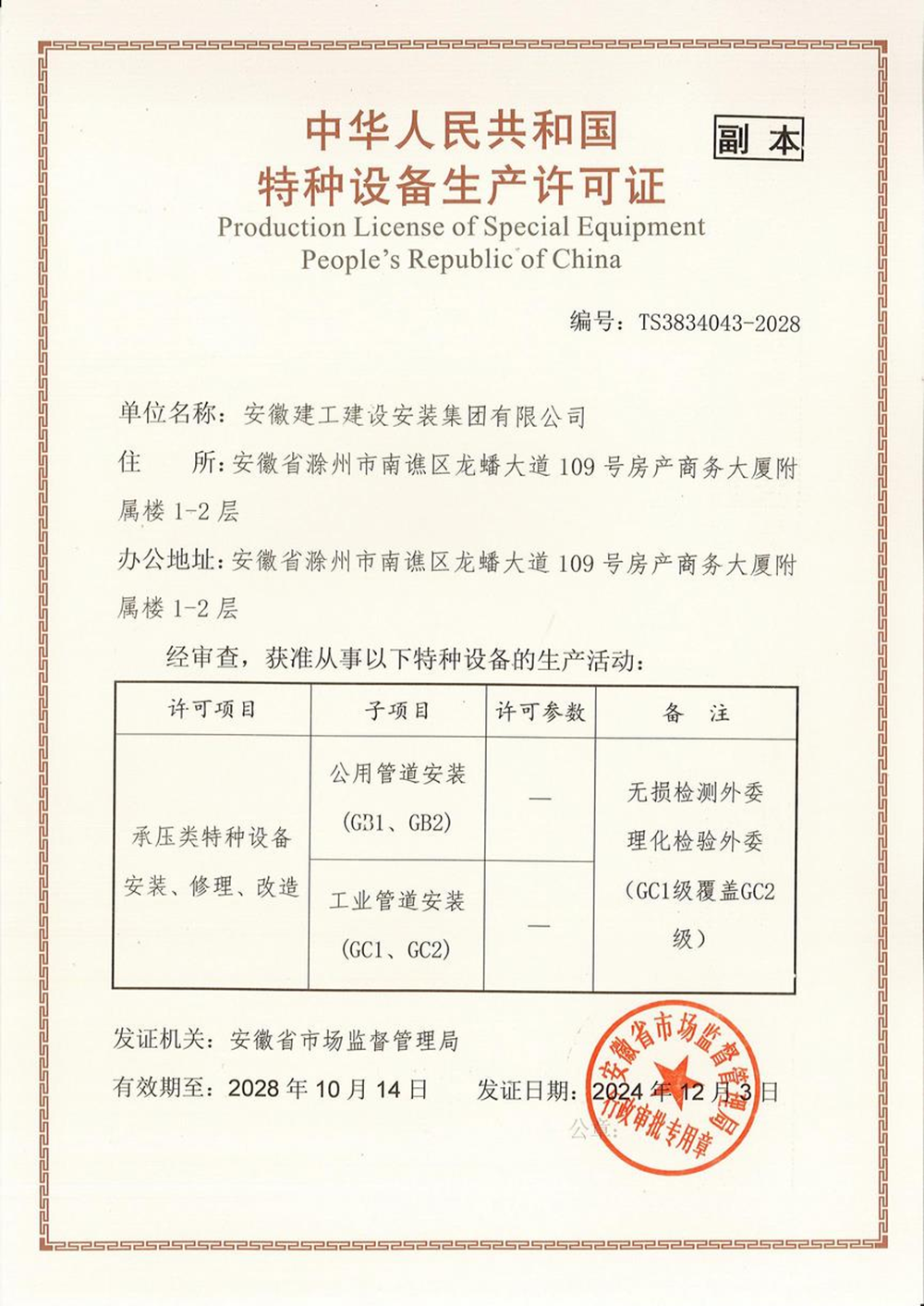 近日,建工安裝“承壓類特種設(shè)備安裝、修理、改造—壓力管道(GB1、GB2)、(GC1、GC2)”延續(xù)換證工作順利通過中國工業(yè)氣體工業(yè)協(xié)會(huì)、安徽省特種設(shè)備檢測院等各方的評(píng)審核查,現(xiàn)已取得安徽省市場監(jiān)督管理局頒發(fā)的新證,為公司相關(guān)業(yè)務(wù)的開展奠定了良好基礎(chǔ)。